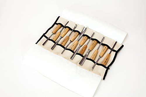 - WIDE VARIETY OF TOOLS – Includes: #1 Straight Chisel 8mm, #1 Skew Chisel 8mm, #5 Gouge 8mm, #5 Gouge 20mm, #7 Gouge 6mm, #7 Gouge 14mm, #7 Heavy Bent Gouge 20mm, #8 Gouge 4mm, #8 Spoon Gouge 10mm, #9 Gouge 10mm, #11 Veiner 3mm, #12 V Parting Tool 6mm. All Tools come packaged in a Schaaf Tools canvas tool roll with protective plastic tips.