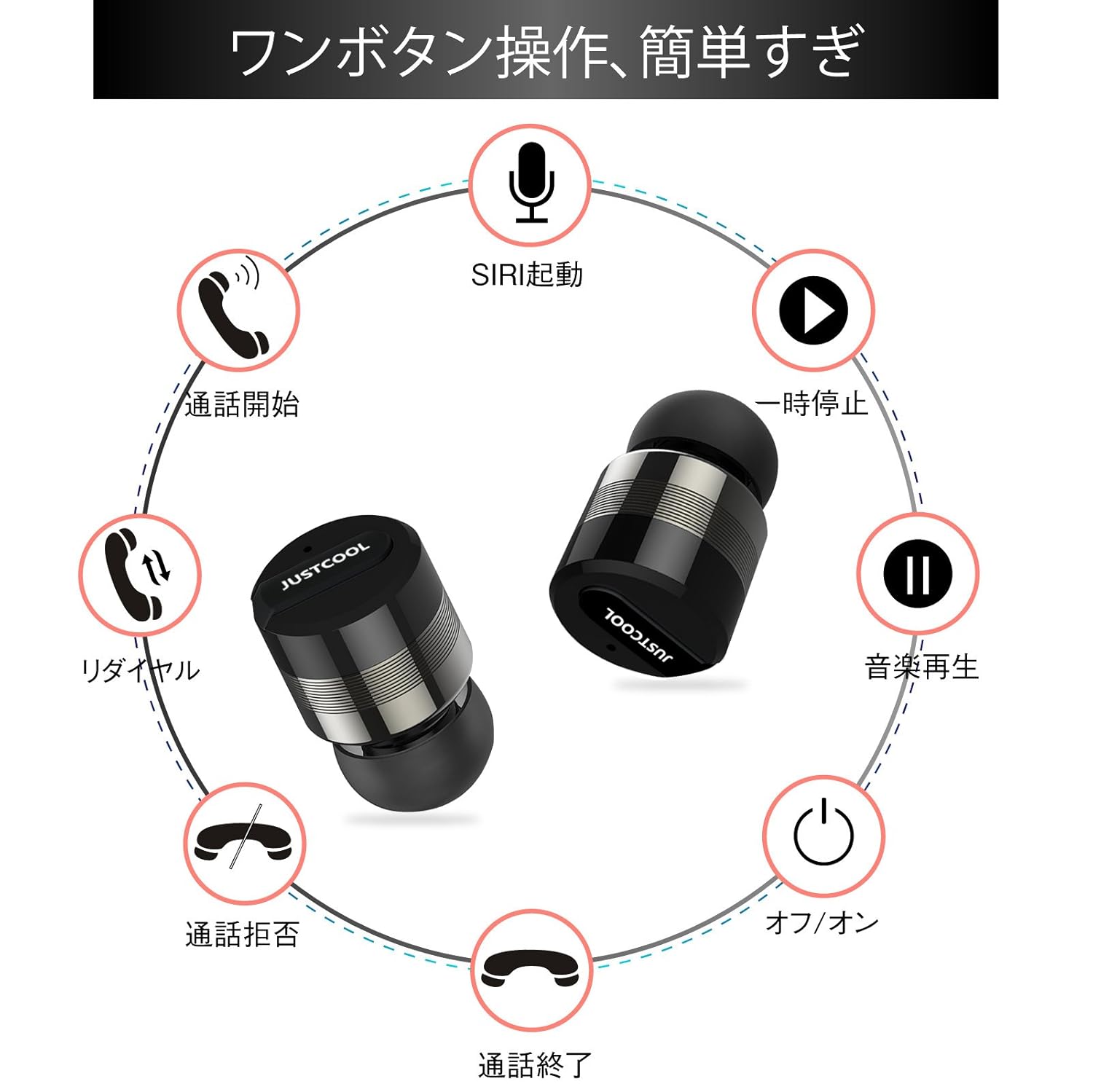 【高音質・ハンズフリー通話可能・操作簡単】外からの音を軽減し、より美しいステレオ音質を楽しめます。その上、ケーブルが邪魔にならないのでどんな場面でもストレスフリーにお使いいただけます。マイク内蔵なので、クリアなハンズフリー通話を実現できます。シンプルのリアルワイヤレスイヤホンで、多機能をワンボタンに集中し、そのワンボタンでSIRI起動、音楽再生/一時停止、通話開始/終了/拒否/リダイヤルなどの操作をすべて実現可能です。