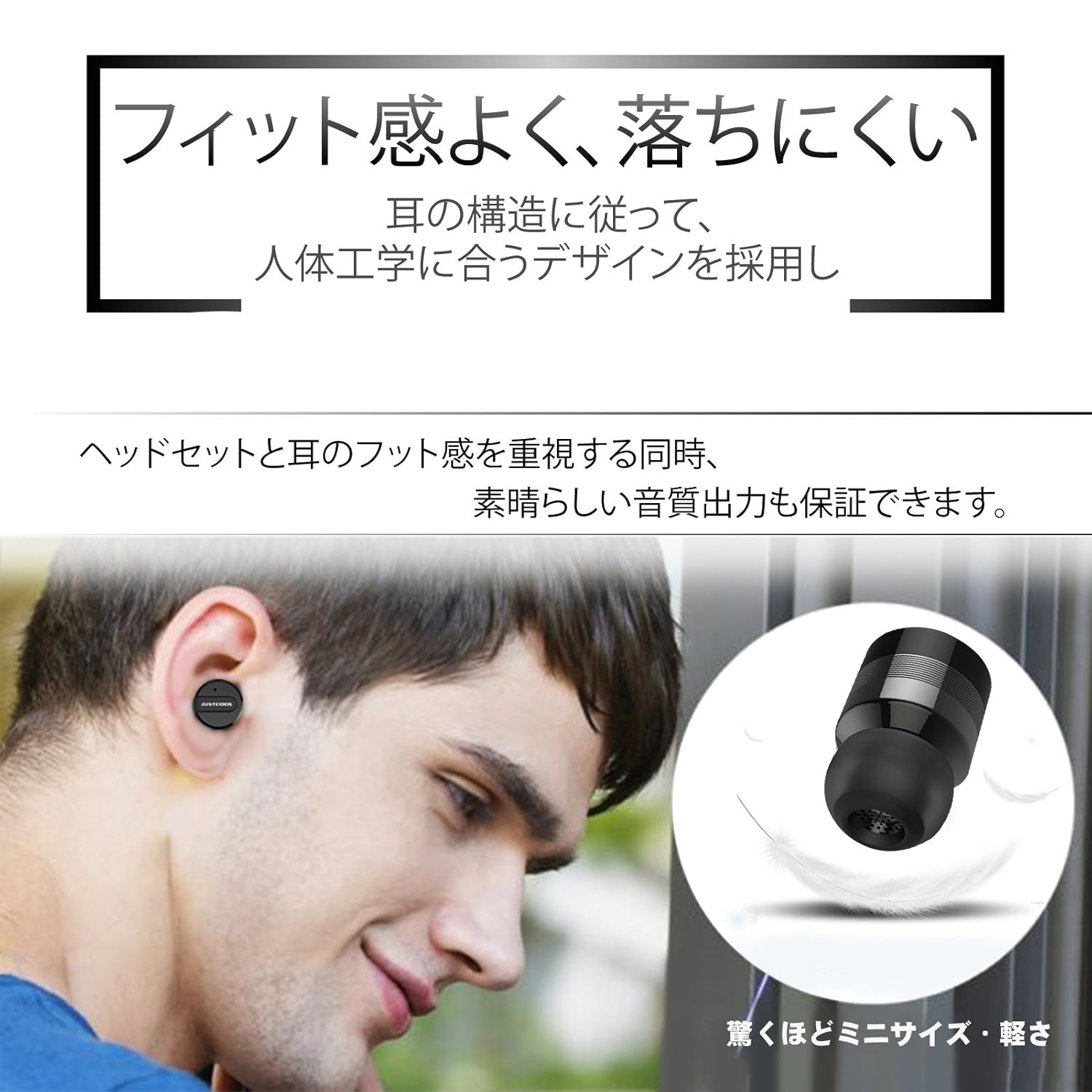 【人間工学設計・フィット感・外れにくい】 超小型で様々な耳の形にフィットするS/M/Lイヤーピースが付属し、耳のサイズにフィットするセッティングが調整可能、誰にも快適な装着性を実現できます。コンパクトで軽く、ランニングやジョギング、スケートなど運動時、また運転など外で仕事する際も外れることがなく、付けていることを忘れてしまう程の装着感、長い時間装着していても疲れません。