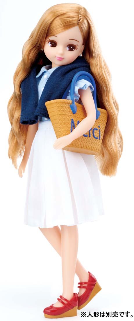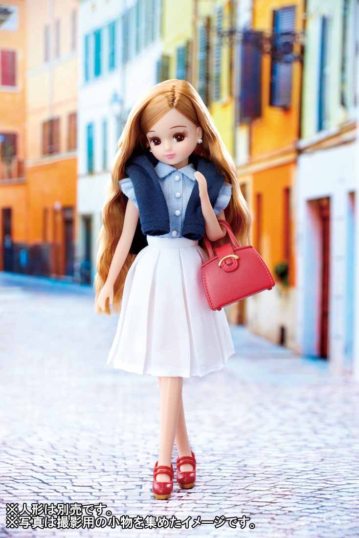 Frill shirt (1), skirt (1), cardigan (1), bag (1), car bag (1), shoes (1)
