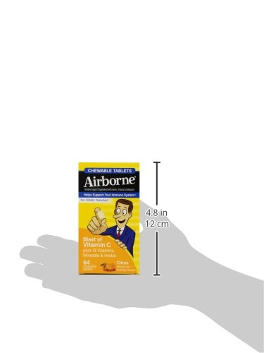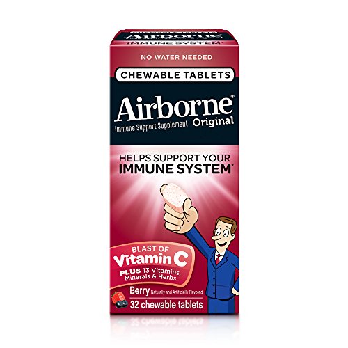 Airborne Chewable Tablets provide real immune support in a great-tasting and easy-to-take form; no water needed. Each serving (4 tablets) delivers a blast of 1000 mg of Vitamin C plus 13 other immune system supporting vitamins, minerals, and herbs, including Echinacea, ginger, and other herbal extracts from whole plant materials.* Same immune support found in Airborne Effervescent Tablets and Gummies. Take up to 3X per day as needed. Gluten Free & No Preservatives. *These Statements have not been evaluated by the Food and Drug Administration. This product is not intended to diagnose, treat, cure or prevent any disease.Feature