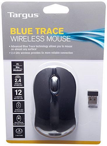 -. Binding : Personal Computers -. Brand : Targus -. Color : Black, Gray -. Department : unisex-adult -. Feature : The ergonomic design reduces wrist strain for comfort and the mouse is ambidextrous for both left and right handed users. / Wireless capability eliminates clutter from the workspace while RF 2.4GHZ technology significantly reduces cordless interference and signal drops allowing the mouse to work up to thirty-three feet away. / The mouse comes equipped with two high-quality Energizer batteries and is designed to provide up to 12 months of battery life depending on usage. / The low power indicator light lets you know when a new set of batteries are needed. / Featuring a sleek, comfortable design, the Targus Wireless Blue Trace mouse provides wireless convenience and the micro USB receiver stores underneath the mouse so it's never lost and always ready for travel. -. Label : Targus -. Manufacturer : Targus -. Model : AMW50US -. MPN : AMW50US -. PackageQuantity : 1 -. PartNumber : AMW50US -. ProductGroup : PC Accessory -. ProductTypeName : COMPUTER_INPUT_DEVICE -. Publisher : Targus -. Size : One Size -. Studio : Targus -. Title : Targus Wireless Blue Trace Mouse