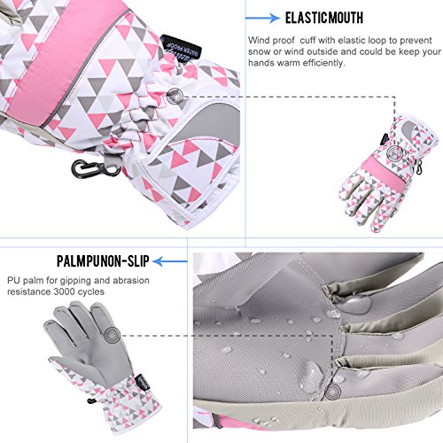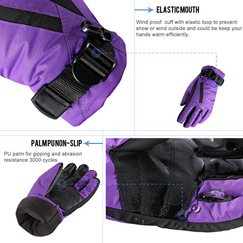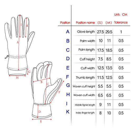 Product Description Materials: Polyester and Olefin; Waterproof Exterior; 3M Thinsulate Insert; PU Palm Function: Breathable Windproof waterproof Protection and Sensitive Touchsreen Function; Anti-slip leather palm;Comfortable Lining;Zipper Pocket and Custom Fit. Sizing: S/M :for hands 7.3" max from palm to longest finger, 11.5" total length of glove M/L:for hands 7.75" max from palm to longest finger, 12" total length of glove L/XL:for hands 8.25" max from palm to longest finger, 12.5" total length of glove Package Includes: 1 x Pair of Snow Gloves 0