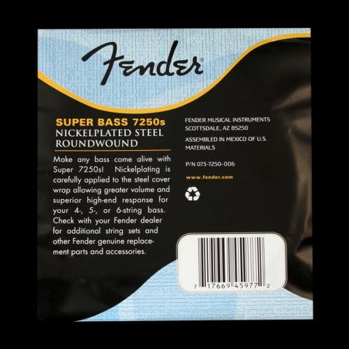 Fender super bass 7250’s are an excellent all-purposebass string. they are particularly good for rock, funk, andany style in which the bass needs to cut through.fender super bass 7250’s combine the high output anddynamic sound of steel with the smooth feel of nickel.the result is a string with bright highs and a thunderouslow end.super bass 7250’s are installed at the factory onall fender us and mexico basses.