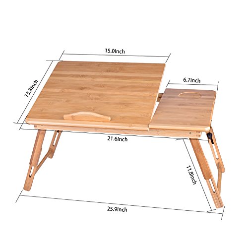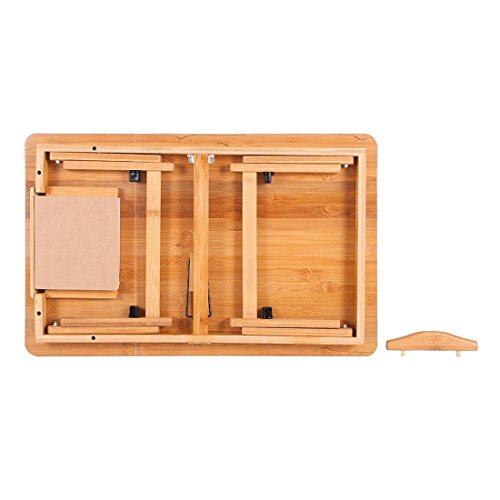 -. Feature : 100% NATURAL BAMBOO: Great workmanship bamboo board, environmental friendly, strong bearing, simple and beautiful / CONVENIENT DRAWER DESIGN: Small drawer with Built-in Magnet for storing pen, note pad or phone without worry of the drawer rolling out / LOCKABLE LEGS: 2 Metal Latches to stop swaying or opening of the legs when moving or storing. Lightweight and foldable, easy to carry / ADJUSTABLE HEIGHTS & WIDTH: Adjustable tilt and legs for better viewing experience. 5 slots to adjust, one more tilting position to choose comparing to other desks. Smooth and flat surface offers more available space to eat and write on / PORTABLE LAPTOP DESK: Product Size: 21.65"L x 13.78"W x 13.78"H(55 x 35 x 35cm)