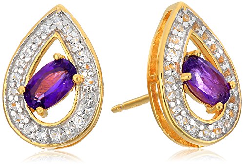 18k Yellow Gold Plated Sterling Silver Two Tone Oval Genuine African Amethyst 5x3mm and Round Genuine White Topaz Teardrop Shape Stud Earrings