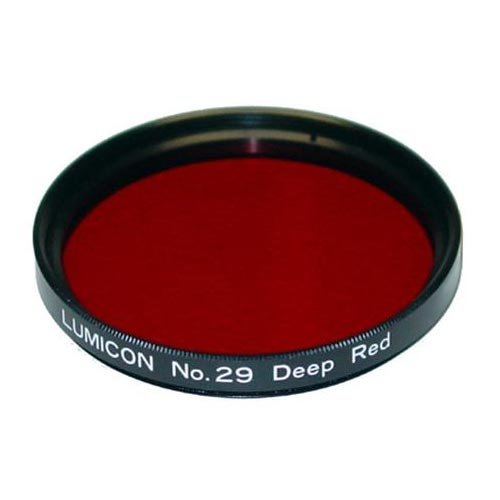 Studio : Lumicon Publisher : Lumicon Binding : Electronics Product Description Lumicon Color Filters are made from renowned Schott and Hoya optical glass and allow for maximum contrast on viewing planetary and lunar detail. Individually precision ground, highly polished with maximum light transmission coatings on both sides, these filters are 100% guaranteed for life. #29 Dark Red Filter Applications: Mercury: Features Venus: Planet/Sky Contrast; Terminator Mars: Maria; Polar Caps Jupiter: Belts; Galilean Moon Transits Saturn: Clouds Manufacturer part number: LF2045 0