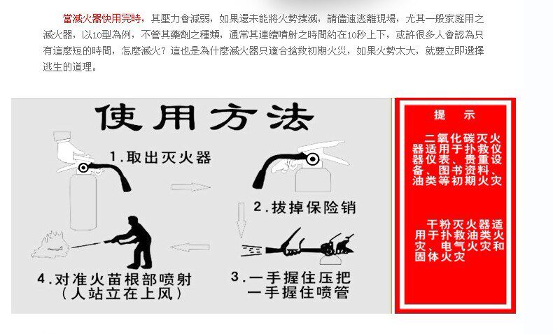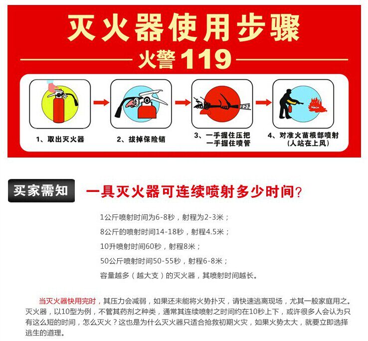 Before use, the first upside down several times, so that pre-loose powder, 3-4 meters away from the fire, pull the pin, one hand holding the nozzle on the fire source, the other hand thumb pressing pressure the dry powder immediately ejected.