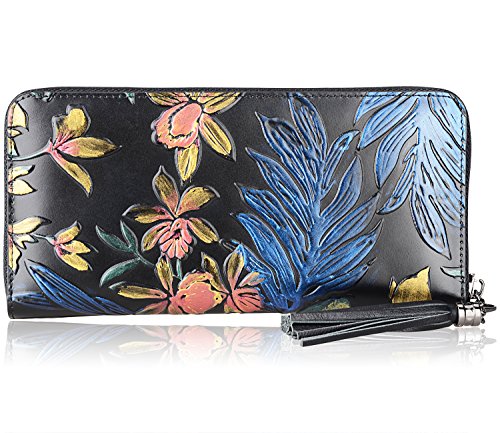 -. Feature : 100% genuine leather with embossed floral; / fabric lining; / zipper closure; / Size: L8"x H4" xW 0.8" ; with a 8" leather strap; weight: 0.21 kg / Interior Details: Inside 1 Zip Pocket, 2 bill compartments, 8 Card slots