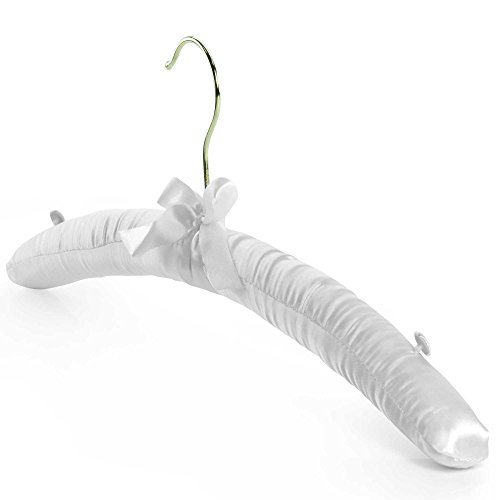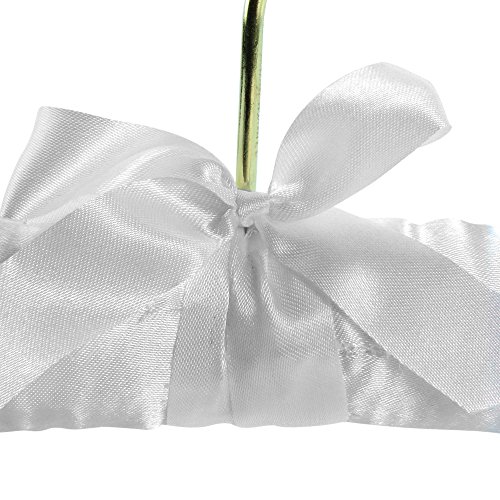-. Feature : Pack of 10 premium quality white satin padded top hangers 17 inches length. / Soft satin cushioning with strengthened inner wooden bar. / Pretty ribbon trim at base of gilt hook. / White fabric covered shoulder buttons to secure straps, loops etc. / For tops, dresses, pants & skirts, bridal & lingerie etc.