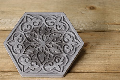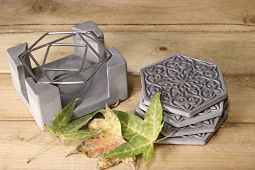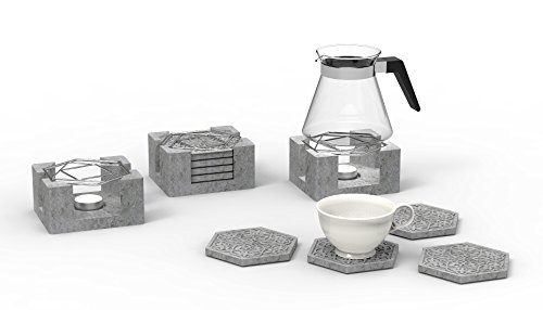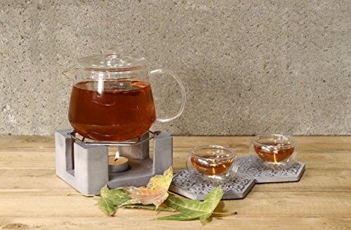 Composed of 4 hexagon-shaped concrete coasters, a concrete base, and a steel teapot warmer plate. Candle is not included.