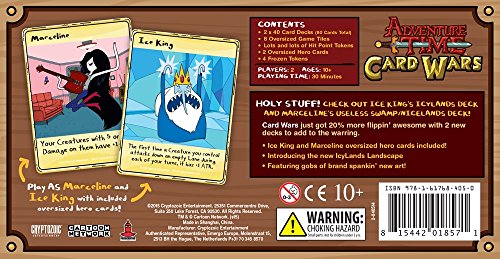 -. Binding : Toy -. Brand : Cryptozoic Entertainment -. EAN : 0815442018571 -. Feature : The debut of the all-new, never-before-seen Icy Lands Landscape! / The debut of Frozen tokens - New, frosty terrors await the unprepared! / All-new, never-before-seen original artwork; made just for this set! / Based on the Card Wars game found in the Adventure Time episodes of the same name / Easy to learn rules! The four lanes focus the action for maximum interaction and fun -. Genre : strategy -. IsAdultProduct : 0 -. ItemPartNumber : 18 -. Label : Cryptozoic Entertainment -. Manufacturer : Cryptozoic Entertainment -. Model : 01857CZE -. MPN : 01857CZE -. NumberOfItems : 1 -. PackageQuantity : 1 -. PartNumber : 01857CZE -. ProductGroup : Toy -. ProductTypeName : TOYS_AND_GAMES -. Publisher : Cryptozoic Entertainment -. ReleaseDate : 2015-03-19 -. Studio : Cryptozoic Entertainment -. Title : Adventure Time Card Wars Ice King vs. Mar Card Game -. UPC : 815442018588 -. Warranty : No Warranty