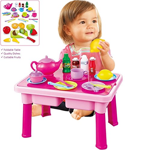 -. Feature : WHAT'S INSIDE: This play set features a Table, Play Food, Tea Set, Toy Dishes, and Bright Cuttable Play Fruits! Table measures 9.8 inches high, perfect to pretend play with toy food and dishes. Not the height for use as a real kids table with a chair. / DISHES SET: Features a set for four people: 4 Plates, 4 Spoons, 4 Knives, 4 Forks, 4 drinks, 1 soup ladle, 1 cup with saucer, 1 Lemon, 1 bowl, and 1 tea cup. / PLAY FRUIT SET: Includes a cuttable Apple, Orange, Banana, Kiwi, Strawberry, Starfruit, and a child-safe knife & cutting board. Fruits are bright and with real-life colors! The fruits come apart with Velcro and the "cutting" makes a great chopping noise because of the Velcro holding it together. Kids 'Love' this slicing sound..! / BUILT TO LAST: Made from durable materials, this playset can outlast the years of toddlerhood! The table was produced with young kids in mind. It's super easy to assemble and take apart so even young kids will love to assemble it themselves! There's also a place inside the table to store all the fruits and dishes when playtime is done! / SATISFACTION GUARANTEED: This imaginative toy is a perfect birthday or holiday gift to any young boy or girl. 100% Kids-Smiles guaranteed! if you are unhappy with the toy for any reason, just contact us for a hassle free refund.