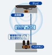 ???テレビやオーディオ機器と接続をした送信機から、最大30m離れた場所でも、壁やドアなどの障害物にさえぎられることなく、クリアなサウンドが楽しめる。