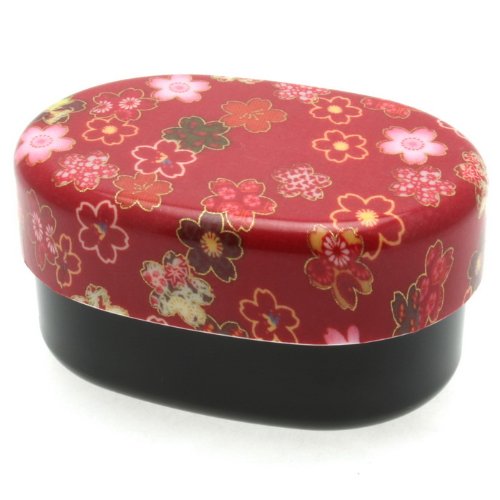 This colorful bento box features cherry blossoms made of traditional textile and kimono patterns. This bento box has two tiers to keep food in separate compartments, and the top tier has a press on lid to prevent leaks. An elastic band is included to secure the two tiers together. This bento box is the perfect size for lunch, or to transport snacks or other edibles.