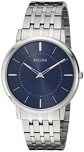 From the Classic Collection, the Bulova bracelet watch features a new ultra-slim case in stainless steel and blue dial and flat mineral glass.