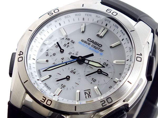 ★ CASIO WAVECEPTOR 電波・ソーラー 国内正規品 ★  商品仕様:(約)H43×W43×D13.5mm、重さ(約)50g、腕回り最大(約)21cm ベルト幅(約)17.5mm ステンレス(ケース)、ラバー(ベルト) ボックス・保証書・取扱説明書