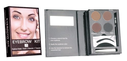 eyebrow kit with stencils comes with brush, and tweezers, mirror 4 colors of eyebrow powders. perfect for everyone Brand : Malibu Glitz EAN : 0716189591405 Package Dimensions(LxWxH) : 13x10x3cm ; 45 g