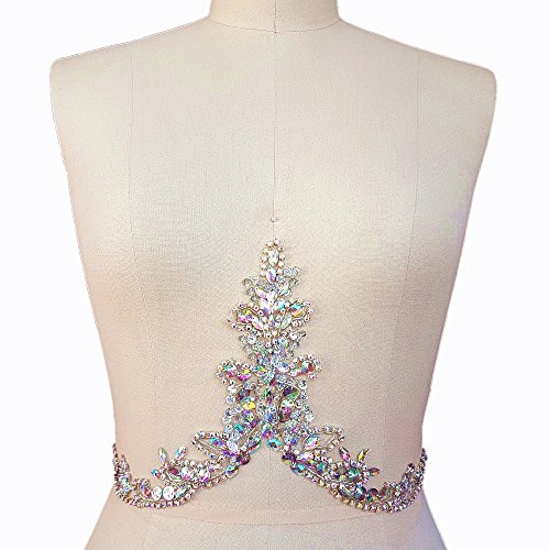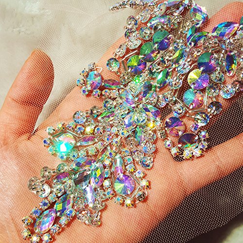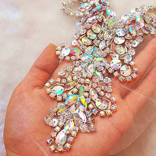 Handmade Beaded Sequin AB Color Bling Sew On Neckline Rhinestone Crystal Trim Bridal Applique Design Patch Sewing for Wedding Dresses DIY Decoration 20x34cm (AB)