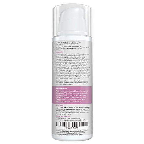 Each Pump contains 20 mg of Pharmaceutical Grade Bioidentical Progesterone USP derived from Wild Yams. High quality ingredients dosed with a convenient pump. 600mg of Progesterone per fluid ounce, 3000mg of Progesterone per bottle, approximately 150 Pumps per Bottle.