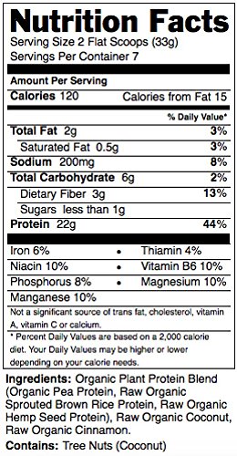 -. Feature : SUPER DIGESTIBLE vegan protein powder blend with super clean ingredients / INGREDIENTS - Organic vegan protein powder blend (organic pea protein, raw organic sprouted brown rice protein, raw organic h.e.m.p seed protein), raw organic coconut, raw organic cinnamon (4%). / VEGAN SOCIETY and SOIL ASSOCIATION certified. Blended & packed in GREAT BRITAIN. Gluten free, soy free, dairy free. / 22/24g PLANT PROTEIN per serving - Complete Blend 3 Plant Proteins - pea, raw sprouted brown rice and raw h.e.m.p seed / All nine ESSENTIAL AMINO ACIDS and more! LOW IN SUGAR