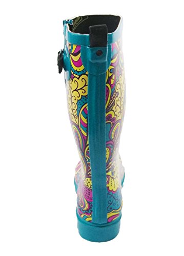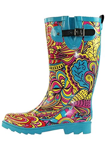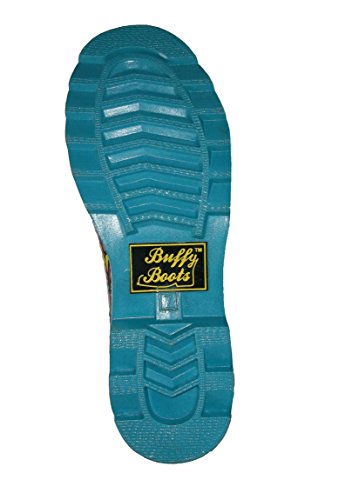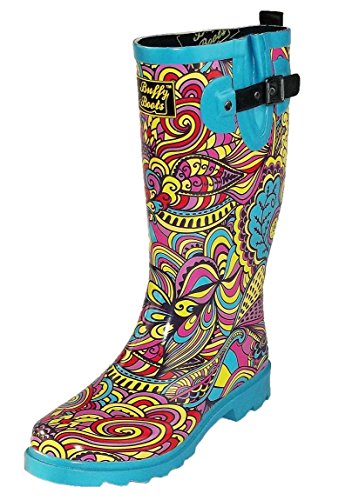 Style, comfort and function are what Buffy Boots are all about. We designed our rubber rain boots to not only look great, but unlike others, they are a pleasure to wear - even when it isn't raining! Designed in the United States, each waterproof rain boot is made from the highest quality all natural rubber and features strong synthetic leather buckles and pull-straps, making them both waterproof and lightweight. Inside, Buffy Boots feature a multi-layer removable thick cushioned foam foot bed insole and cotton lining to keep warmth in, dampness out and ensure comfort all day long. Outside, the sturdy treaded sole provides traction to prevent slipping in all types of conditions. Buffy Boots are not only durable in extreme weather conditions - they also look great! Each design is a Buffy Boots original limited edition - so just like you, they are one-of-a-kind! Our vibrant colors and unique designs will shine even during the rainiest days! Product Specifications (size 7) Measurements ? Heel measures approximately 1.00" ? Platform measures approximately 0.50" ? Circumference measures approximately 15.50" ? Shaft height measures approximately 12.00" Materials ? Upper Material: Natural Rubber ? Out-sole: Molded Natural Rubber ? Buckle: Metal ? Adjustable Strap and Pull Tab: Synthetic Leather ? Lining: Cotton ? Insole: Multi-Layered Foam 0 |