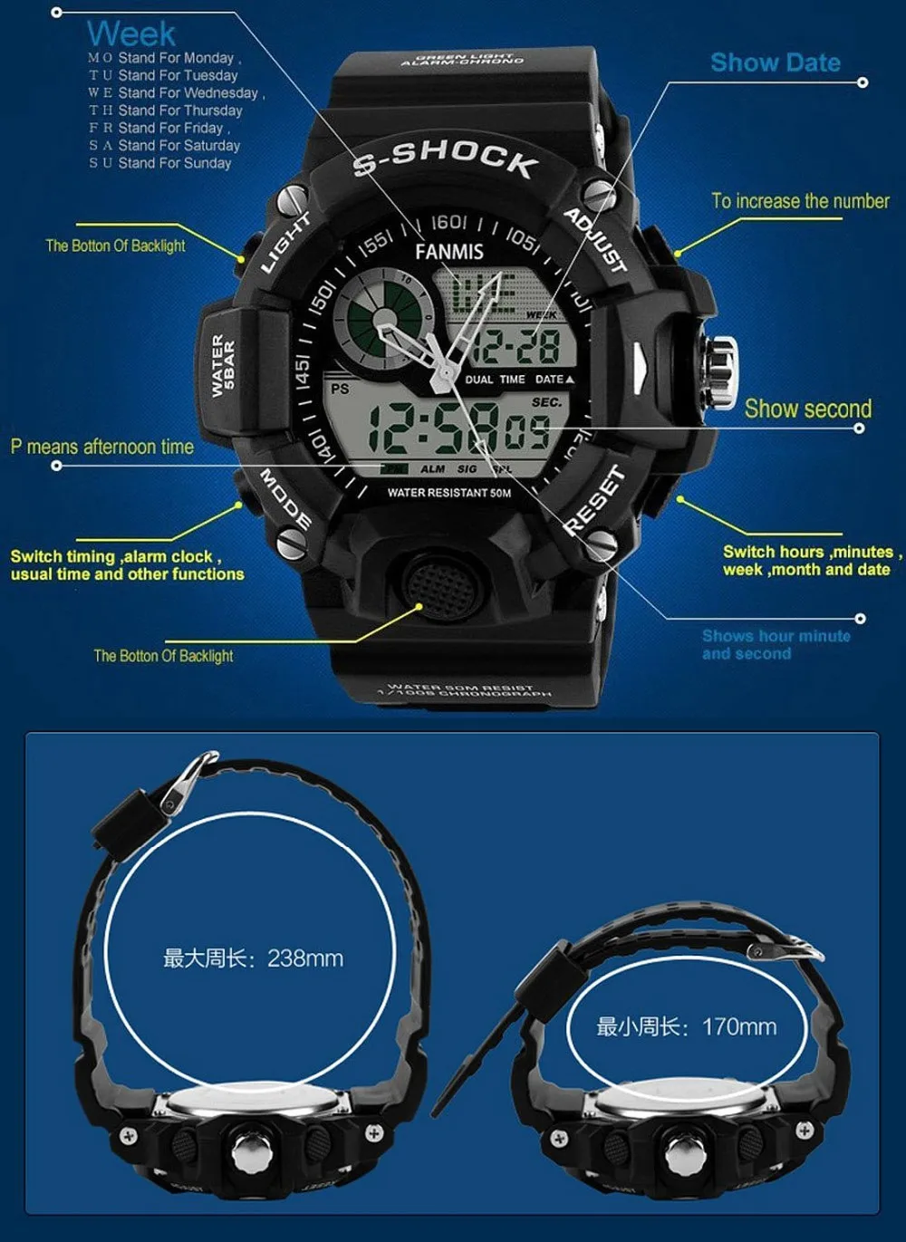 Feature:Water Resistant,LED display,Luminous,Multiple Time Zone,Stop Watch,Back Light,Complete Calendar,Shock Resistant,Diver,Chronograph,Auto Date,Alarm