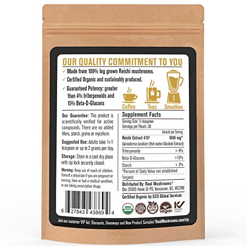 At Real Mushrooms we pride ourselves on knowing that our mushroom products are of the highest quality. Our Reishi 415 is made from 100%, log grown, certified organic, Reishi mushroom fruiting bodies. They are hot water extracted to pull out the beta-glucans. In the case of Reishi, it is also extracted with alcohol to obtain the non-water soluble triterpenes. This is commonly called dual extraction.