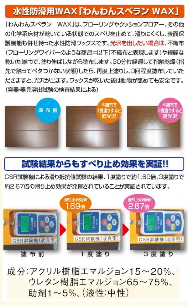 すぐれた防滑効果を発揮し、犬のスベリによるケガを防止するとともに、オシッコ等の臭いの染みつきや爪の傷を防ぎます。また、長時間美しい輝きを維持し、お掃除もラクラク。ワックスがけの必要もありません。 |
