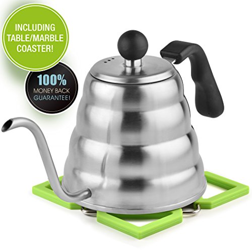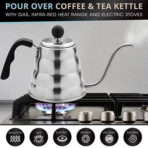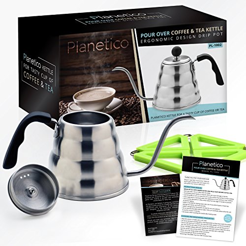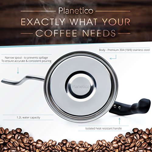 -. Brand : Planetico -. Color : Brushed Metal -. EAN : 0600346425217 -. Feature : QUALITY MATERIALS - TO PREVENT RUST and FOR FASTER WATER BOILING - Premium 304 (18/8) stainless steel (except handle & knob) 0.8 mm Body thickness. Build to meet higher flames and faster boiling. Solid. DISHWASHER-SAFE. 1.2L water capacity. GREAT TRENDY SILICON COASTER attached FREE to PROTECT YOUR PRECIOUS SURFACES. / SAFE & COMFORTABLE TO USE with all Stovetop: Gas, Infra-red, Induction, Radiant, Halogen, Sheathed or Electric Stoves. LID FITS TIGHT to prevent falling out when tipped. HEAT RESISTANT COMFORTABLE HANDLE FOR SAFE AND EASY GRIP. Its narrow spout PREVENTS SPILLAGE or accidents for utmost satisfaction and pleasant usage. Perfect for indoor and outdoor applications. For Home, Office, Barbeque or Camping. Easy to clean. / GOOSE NECK, NARROW SPOUT - Planetico new look kettle ensures accurate, smooth and consistent pouring. ITS BUILT TO ACHIEVE BEST BREW, tastiest and finest coffee or tea. Meeting popular coffee makers (such as Chemex). / TRADITIONAL AND FASHIONABLE DESIGN - Planetico Gooseneck Kettle is designed and built in a traditional way keeping. Matt polishing finish for a truly outstanding look and pleasure. / A GREAT GIFT - For your loved ones and friends; We commit to 100% SATISFACTION and HASSLE-FREE REFUND once its required. 2 Gifts: FREE SILICON TABLE COASTER BONUS ! and FREE EBOOK BONUS ! -. Label : Planetico -. Manufacturer : Planetico -. Model : Pl-1002 -. PackageQuantity : 1 -. ProductGroup : Kitchen -. ProductTypeName : KITCHEN -. Publisher : Planetico -. Size : 1.2 L / 40 OZ -. Studio : Planetico -. Title : Planetico Pour Over Kettle and Silicon Coaster - For Coffee and Tea, Ergonomic Designed Drip Pot w/Gooseneck and Narrow Spout, Brushed Stainless Steel - Ideal w/Stovetop, Gas, IR, Etc. - 1.2 L/40 Oz -. UPC : 600346425217