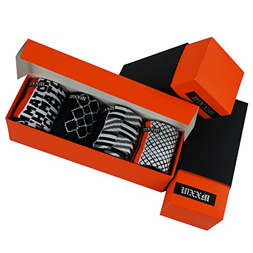 -. Binding : Apparel -. Brand : WXXM -. Department : womens -. Feature : Fashion Design: Stripes and dots patterned design will never out of fashion; Black and white can be paired with any clothes in your wardrobe / High Quality: Our premium Nylon blend fabric features great durability and anti-extension; Easy to wash and easy to dry; no worry about fading and deformation / Keep Warm & Dryness: Looped thermal pile keeps your feet comfortable and warm; Moisture-wicking feature keeps your feet cool and dry / Shoe Size Fit:US Women 6-11/9-13 / Functions: Ideal for everyday wearing in cooler weather whether indoor or outdoor; Great gift for yourself, friends, family members and any one you love -. ProductGroup : Apparel -. ProductTypeName : SOCKSHOSIERY -. Title : Fashion Crew Dress Socks, WXXM Womens Unique Funny Design Durable Novelty Crew Socks