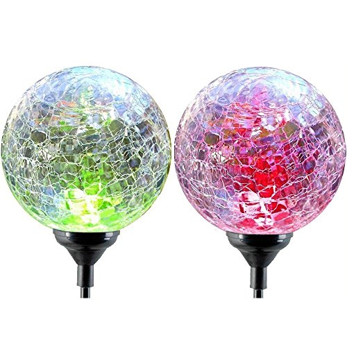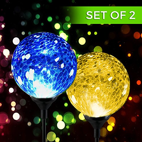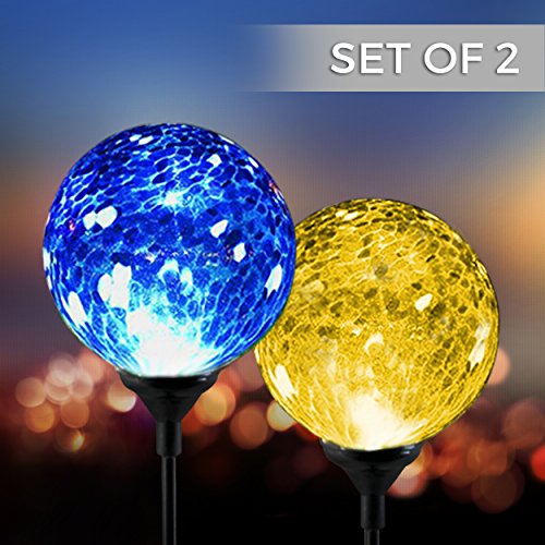 Solar Powered Crackle Glass Ball- Color Changing Stake Lights- Set Of 2- 100% Weatherproof Design- Decorative Landscape Lamps- Wireless Outdoor LED Accent Lighting- Best Decor for Garden/ Yard/ Path