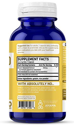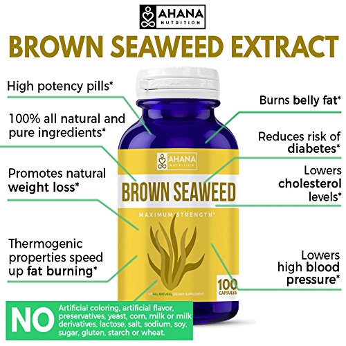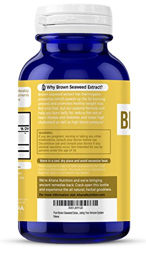 -. Feature : ABSOLUTELY THE BEST BROWN SEAWEED CAPSULES: Ahana Nutrition offers the best Brown Seaweed Extract on the market. Our pills are made from Brown Seaweed and features some of the purest ingredients ensuring only the best for your body. The tablets from Ahana Nutrition are packed with health benefits that will ensure a greater wellness for your body. / COMPLETELY TASTELESS & ODORLESS: Our Brown Seaweed Pills are completely tasteless and odorless making it extremely easy to use. They are delivered in an easy to swallow capsule form for numerous benefits. Get the fully all natural & pure brown seaweed powder on the market. / PACKED WITH BENEFITS: Our brown seaweed supplement is filled with benefits for your body. This weight loss solution is backed on years of scientific research. This blend serves to naturally help the body lose weight, boost your immune system, serve as a full body detox, contains tons of therapeutic compounds and so much more. / WHY AHANA NUTRITION'S ORGANIC BROWN SEAWEED : Our pure Brown Seaweed Extract is manufactured in the USA in a FDA registered facility under strict quality control and standards. Our capsules are developed sourcing the best ingredients while ensuring that they do not contain fillers, artificial flavoring or or other harmful derivatives. / 100% SATISFACTION GUARANTEED: If for any reason at all, you are unhappy with your purchase, you'll receive a no questions asked money back guarantee within 30 days.