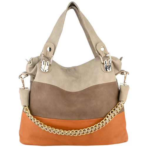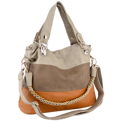 Classic hobo style everyday shoulder bag for women. Tri tone design adds visual interest and compliments different color schemes Removable shoulder strap included. Handle Drop: 6 inches; Decorative Chain Strap: 9 inch drop. Approximate Dimensions (in inches): Exterior - 13 H X 15 W X 5.5 D