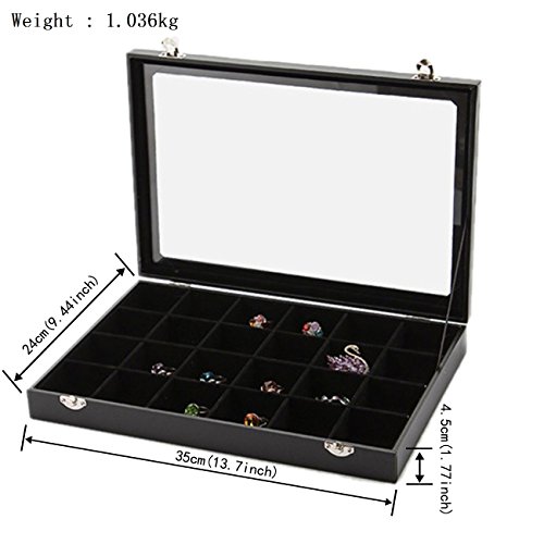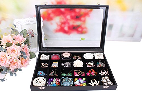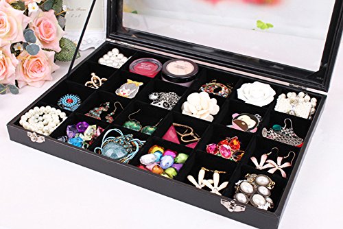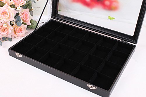 Wuligirl Removable 24 Grid Jewelry Boxes Stackers Jewelry Display Case Clear Top New Black Velvet with Lock (24 Grid Box Black)