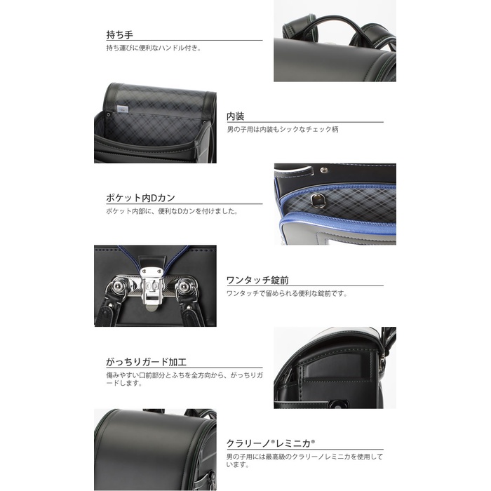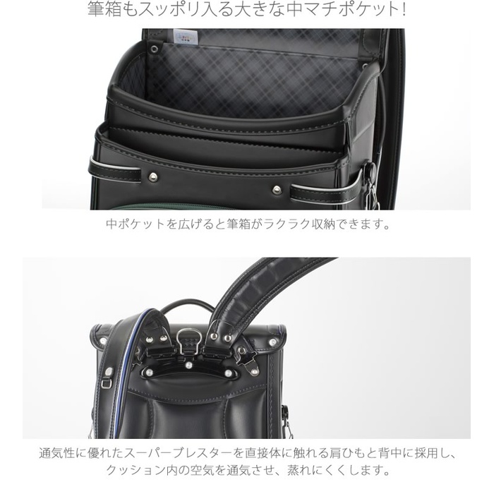 어깨 끈 뒤 소재:컬러 클라리노 중량 약1080g 컬러 블랙×마린 블루,네이비×블랙,블랙×그린,블랙 기능 핸들(손잡이)부착 A4북 파일 수납 사뿐히 # 배캔 사뿐히 # 숄더 리브 구조 어깨 벨트 좌우D캔부 마치(깊이,폭)수:2단+포켓 전포켓:와이드 포켓 마치(깊이,폭) 기능:다부지게 가이드 대마치(깊이,폭) 싸이드:양나스카《》 원터치정 내장:체크 무늬 내장 기능:항균 소취 이너 반사재:반사 테이프반사 판 특징 콤팩트에 A4북 파일이 편안하게 수납.사뿐히 # 숄더 리브 구조에 딱 피트.최고급의 클라리노《레미니카》를 사용.중 포켓을 넓혀 필통이 편안하게 들어 가는 수납력.사뿐히 # 배캔에 등에 피트.사뿐히 # 시리즈[콤팩트 리미티드 사내 아이] [콤팩트 리미티드 소녀]