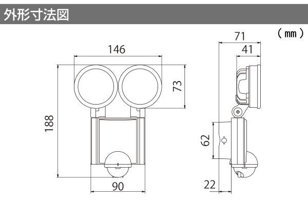 | 仕様 | ■検知方式:赤外線受動式 ■電源電圧:AC100V 50/60Hz ■消費電力:約20W(待機時約0.2W) ■使用周囲温度範囲:-20~40度 ■点灯保持時間:約5秒~約10分間 ■点灯開始照度:約5lx(夜)~(昼) ■耐水性能:IPX4(防沫形) ■電源コード長:約3.0m ■光源:白色LED×2灯(全光束約1700lm) ※LEDの交換はできません |