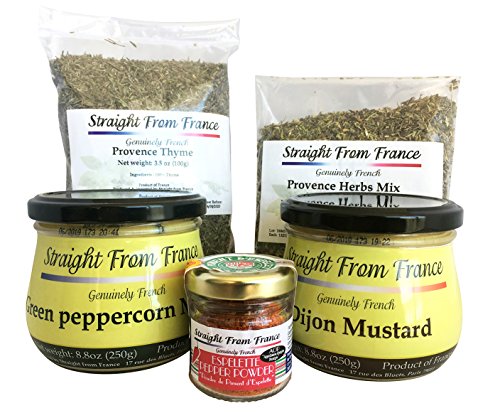-. Binding : Misc. -. Brand : Straight From France -. Feature : Imported straight from France / This assortment contains 5 products from France: one bag of Provence herbs, a jar of Espelette pepper powder, one bag of Provence thyme and two gourmet mustards / Great as a gift or to treat yourself! / Perfect for lovers of French cooking -. Label : Straight from France -. Manufacturer : Straight from France -. ProductGroup : Grocery -. ProductTypeName : GOURMET_FOOD -. Publisher : Straight from France -. Studio : Straight from France -. Title : Straight from France - French Seasoning Assortment basket 5 products