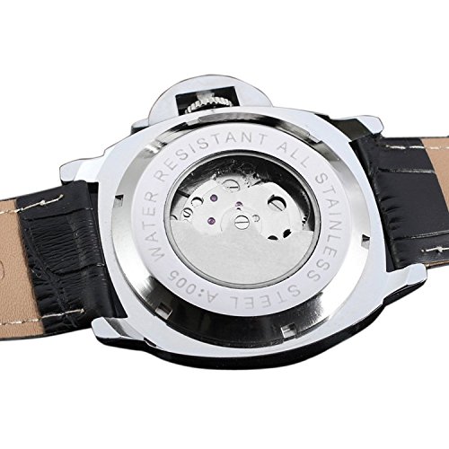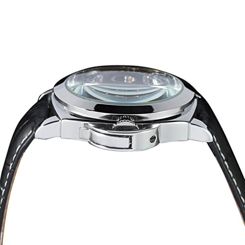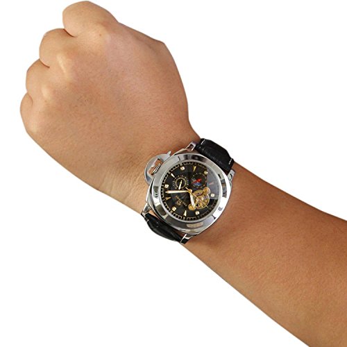 -. Feature : GuTe出品のメンズの自動巻き腕時計 / スケルトンのトゥールビョンデザインからパーツが動いているところが見えるのは楽しみ / ちょっとおかしい二十四時間表示と月表示にちゃんとしているムーンフェイス / 直径約44mmに厚さ約15.2mmのビッグで分厚いケースに革バンドが幅約20mmの腕時計 / 説明書は付いておりませんが、本ページの「商品説明文」のところに簡単な調節方法も書いてありますので、よくわからない方々はぜひぜひご覧下さい。そして、ここで要注意:バンドの幅はベルトの真中あたりの幅なので、バンドを変えたい方は念のためケースに一番近いところを測て下さい、またはお問い合わせ下さい。そして、「ケースの直径」は一般的にリューズ含みの直径です。他に何か問題がありましたら、ご遠慮なくお問い合わせください。