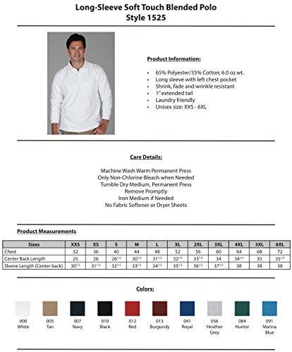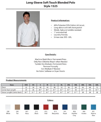 Binding : Apparel Product Description Soft touch blended pique polo with long sleeves and left chest pocket is colorful and sporty. Affordable and smart, this polo has style details that match premium knits. Perfect for delivery service, theme parks, or lawn service. Embroiders well. 65% Polyester/35% Cotton; 6.0 oz.wt, Long sleeve with left chest pocket, Shrink, fade and wrinkle resistant, 1" extended tail, Laundry friendly, Unisex size: XXS - 6XL. 0