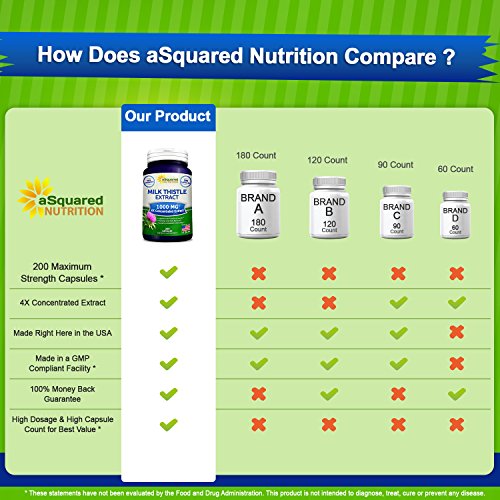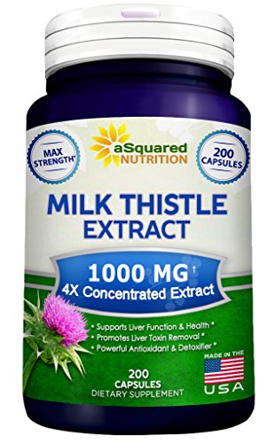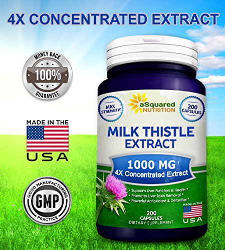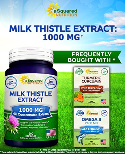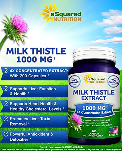 -. Binding : Health and Beauty -. Brand : aSquared Nutrition -. EAN : 0647166393319 -. Feature : MAXIMUM STRENGTH MILK THISTLE EXTRACT: Our 4X Concentrated Milk Thistle Extract is equivalent to 1000 MG of Milk Thistle per capsule. Our potent formula is made from Milk Thistle Extract Seed (Silybum Marianum seed) to ensure you are receiving a natural and pure extract. Providing you with 200 capsules in every bottle, our Milk Thistle 1000 MG formula is backed by our 100% MONEY BACK GUARANTEE and is made right here in the USA in a GMP compliant facility. * / CLEANSE & DETOX YOUR LIVER: Your Liver plays a vital role in helping rid the body of harmful waste and toxins. Milk Thistle supports liver function and health. It is a powerful antioxidant, free radical scavenger and detoxifier that promotes liver toxin removal. Additionally, Milk Thistle supports heart health, healthy cholesterol levels and may contain anti-aging properties. Our powerful 1000 MG formula can be taken either once a day or twice daily for maximum cleansing. * / FEEL THE DIFFERENCE WITH NATURAL CLEANSING: Our high potency Milk Thistle formula contains ONLY three ingredients: Milk Thistle Seed Extract, Gelatin (for the capsule), and Rice Powder. We don't add any extraneous fillers, binders or preservatives, and only use the highest quality ingredients. Our Milk Thistle Capsules are not to be mistaken with Milk Thistle liquid, tablet, oil, patch, soft gel, powder, tea, chewable gummies, drop, shot, drink, or spray. * / 100% MONEY BACK GUARANTEE: Best value available on Amazon. Our maximum strength Milk Thistle complex is MADE IN THE USA in a GMP compliant facility. Each bottle of our Milk Thistle 1000mg formula contains 200 capsules of 1000mg Milk Thistle. For most people, this is a full 200-day supply. At the highest daily dose we still provide a 100-day supply for an amazing value. If you are dissatisfied with the product you have 30 days to return it for a full refund. * / PROVEN TRACK RECORD: aSquared Nutrition prides themselves on quality and reliability. You'll love our ever-expanding product line from our CoQ10 400mg (Coenzyme Q10) to Vitamin B-12 (Methyl B12). Newer products include our Resveratrol, DHEA 100 MG, Biotin 10,000 MCG, CLA 1250, Turmeric Curcumin, Organic Ceylon Cinnamon, Omega 3 Fish Oil, Green Coffee Bean Extract, Garcinia Cambogia, Candida Cleanse, Colon Detox & Cleanse, Prostate Support, Panax Ginseng and Caralluma Fimbriata to name a few. * -. IsAdultProduct : 0 -. Label : aSquared Brands -. LegalDisclaimer : These Statements have not been evaluated by the Food and Drug Administration. This Product is not intended to diagnose, treat, cure or prevent any disease. -. Manufacturer : aSquared Brands -. MPN : Milk_thistle_200ct_1000mg -. PackageQuantity : 1 -. PartNumber : Milk_thistle_200ct_1000mg -. ProductGroup : Health and Beauty -. ProductTypeName : HEALTH_PERSONAL_CARE -. Publisher : aSquared Brands -. Studio : aSquared Brands -. Title : Pure Milk Thistle Supplement 1000mg - 200 Capsules, Max Strength 4X Concentrated Extract 4:1 Milk Thistle Seed Powder Herb Pills, 1000 mg Silymarin Extract for Liver Support, Cleanse, Detox & Health -. UPC : 647166393319