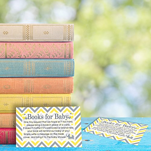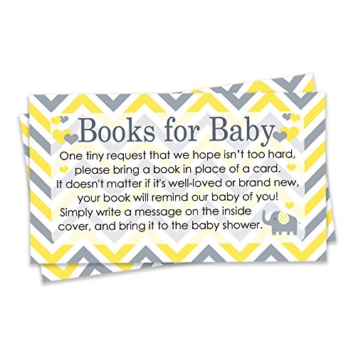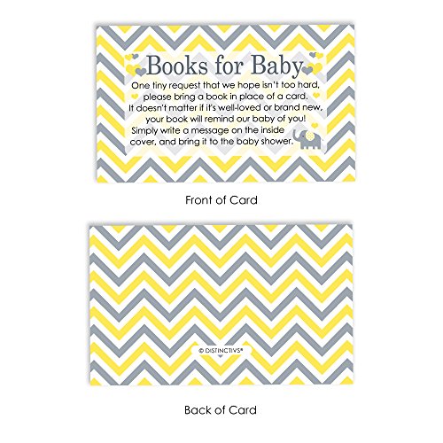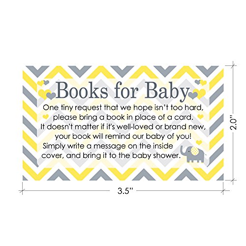 Studio : DISTINCTIVS Publisher : DISTINCTIVS Binding : Health and Beauty Product Description Order includes 20 Yellow and Gray Elephant Baby Shower Books for Baby Request Cards to be sent with gender neutral baby shower invitations. Cards feature a sweet rhyming message requesting guests bring baby books instead of cards to the baby shower. Professionally printed on premium high gloss cardstock. Cards are 3.5" x 2" each to easily fit inside invitation envelopes. Invitations, envelopes, and other props pictured are not included with your order. 0