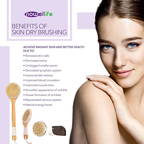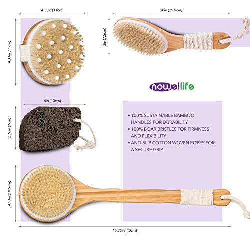 - ✨ NOWellife offers fine quality body dry brushing set for a spa-like experience at the comfort of your own home – both for women and men. All you need for glowing skin and a healthier you - 3 different types of pure boar bristle brushes with eco-friendly bamboo handles along with a durable and light pumice stone made of natural volcanic rock for softer feet. All come with strings for convenient hanging. New to dry brushing? Don’t worry! Step-by-step guide to dry brushing and tips are included.