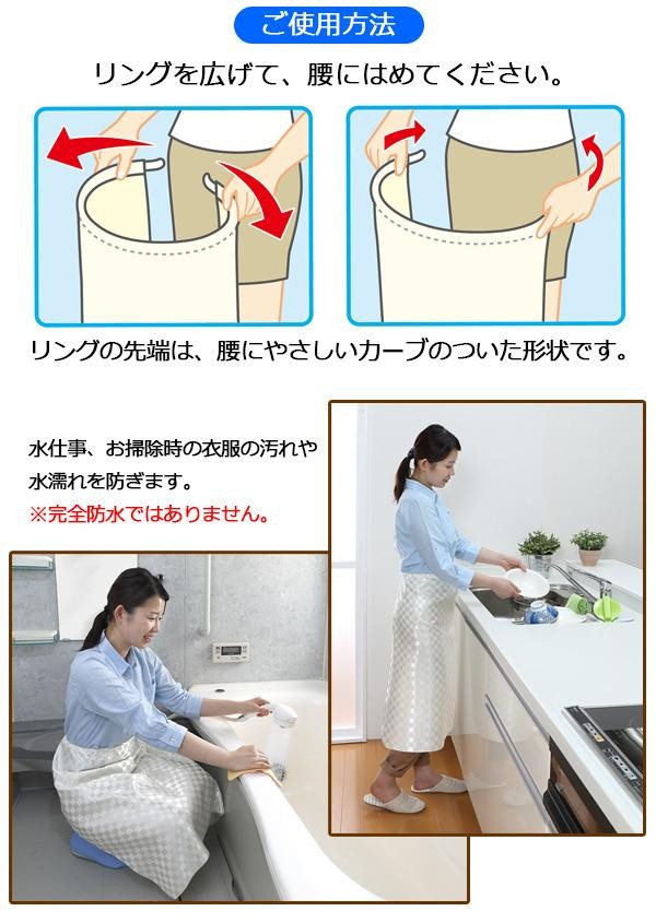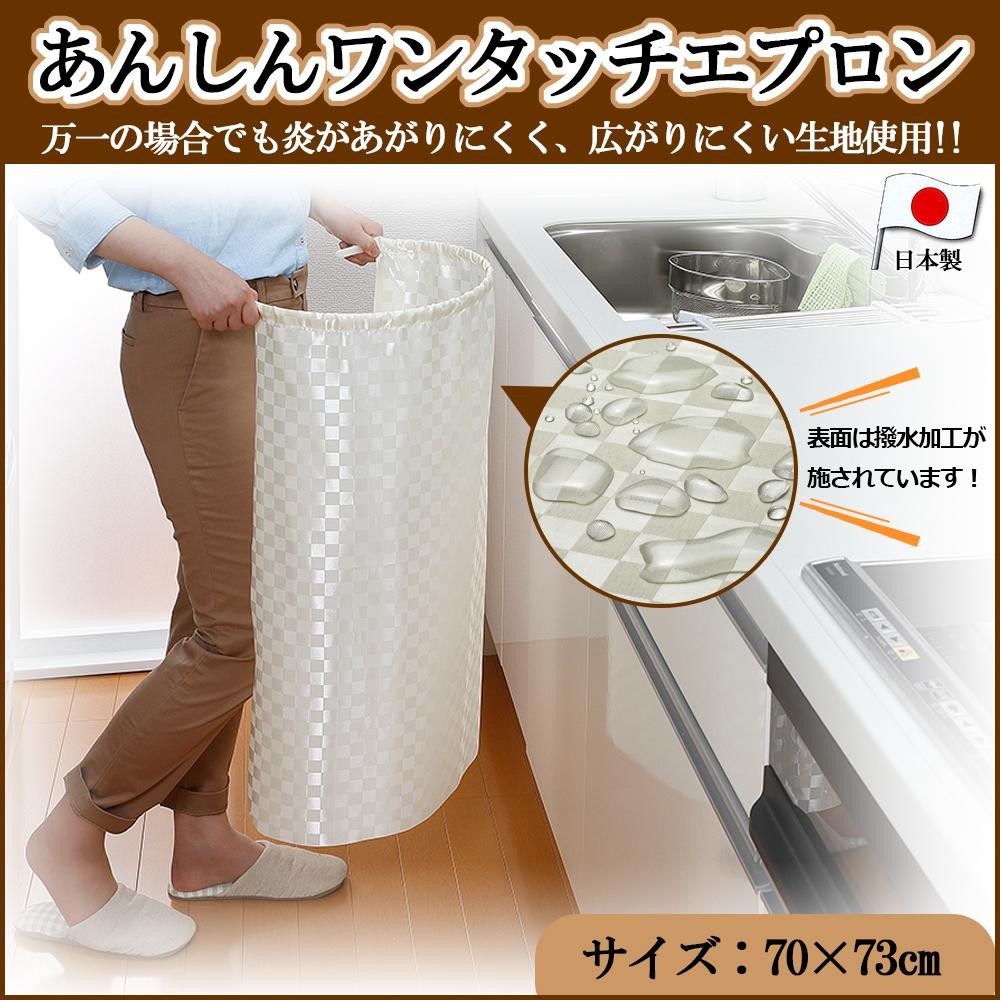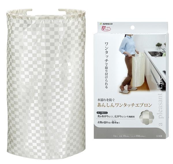 ワンタッチで簡単に取り付け、取り外しができるエプロンです。万一の時に、炎が燃え広がりにくい生地を使用しています。表面には撥水加工を施しており、水仕事・お掃除時の衣服の汚れや水濡れを防ぎます。 |
