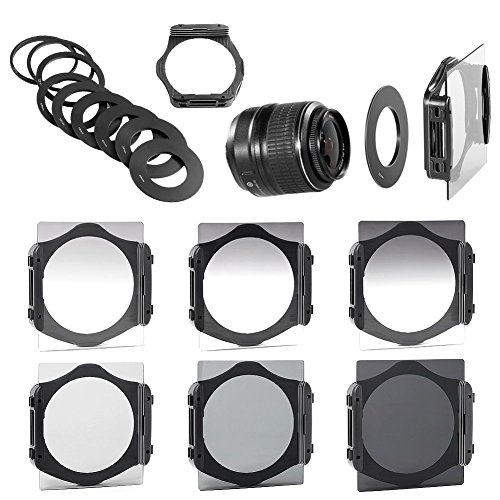 ** PLEASE NOTE: CAMERA & LENS NOT INCLUDED! ** Kit includes:(3)Full ND Filters (ND2, ND4, ND8) + (3)Graduated ND Filters (G.ND2, G.ND4, G.N8) + (9)Metal Adapter Rings (49mm, 52mm, 55mm, 58mm, 62mm, 67mm, 72mm, 77mm, 82mm) + (1)Square Filter Holder + (1)Filter Carrying Pouch.