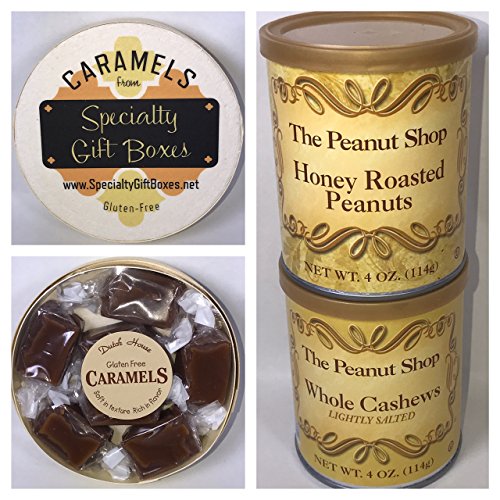 - Also includes: No Bake Strawberry Cheesecake Mix, Single Pot Premium French Vanilla Coffee by Steep & Brew, 4 oz. Whole Cashews Tin by The Peanut Shop of Williamsburg, Dulce de Leche Dip with Breadsticks, Rural Route One 6 oz. Classic Caramel Popcorn, Rural Route One 2 oz. Classic Cheddar Cheese Popcorn, 4 oz. Honey Roasted Peanuts by The Peanut Shop of Williamsburg, Lemonade Mix (Makes 1/2 Gallon), and Round Gift Box of 7 Fleur de Sel Sea Salt Caramels