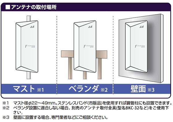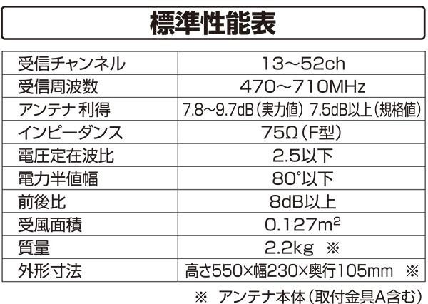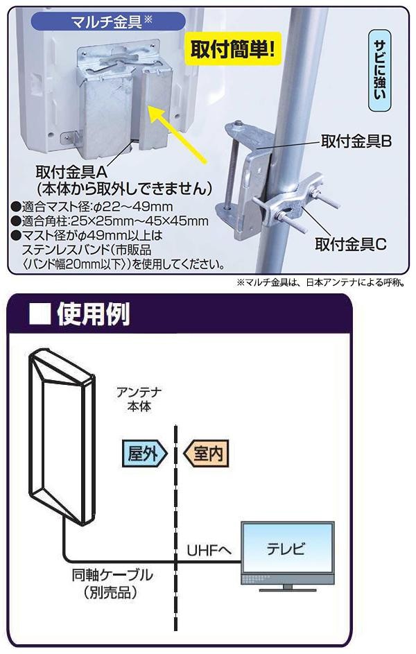 水平偏波専用、強・中電界地区向けの屋外用地上デジタル薄型アンテナです。付属のマルチ金具でマスト・ベランダ・壁面等様々な場所に設置できます。
