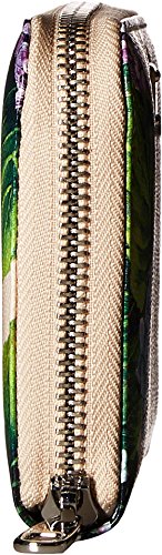 Lined interior features multiple slide compartments, center zip pocket, and twelve credit card slots for easy storage.