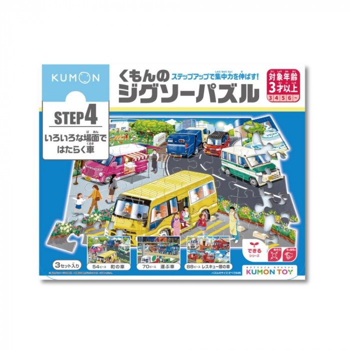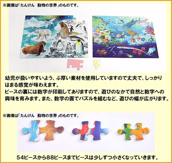 | 遊びながら学習につながる集中力と作業力を伸ばす、「スモールステップ」方式のジグソーパズルのセット。このSTEP4は、54ピースのパズルから、88ピースのパズルまで、合計3枚のジグソーパズルがセットされています。少しずつピースを増やしていくことで、パズルを完成させる達成感を味わいながら、集中力と作業力を高めていけます。 |