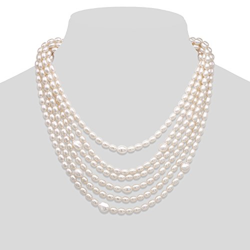 A Beautiful Sterling Silver 6-rows 3-3.5mm, 6-6.5mm, and 10-10.5mm White Freshwater Cultured Pearl Necklace 18" Length. Secured With a Sterling Silver 3-Rows Tube-clasp. Please Contact Us for Detail if You Did not See What You Need.